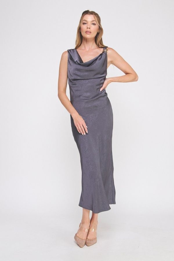 The draped cowl neckline flatters effortlessly, offering a modern take on timeless femininity. Soft folds cascade into a sleek midi silhouette, striking the perfect balance between chic and wearable. The standout accent—a delicate brooch detail—adds just the right amount of sparkle, making this dress a festive favorite for the holiday season.
