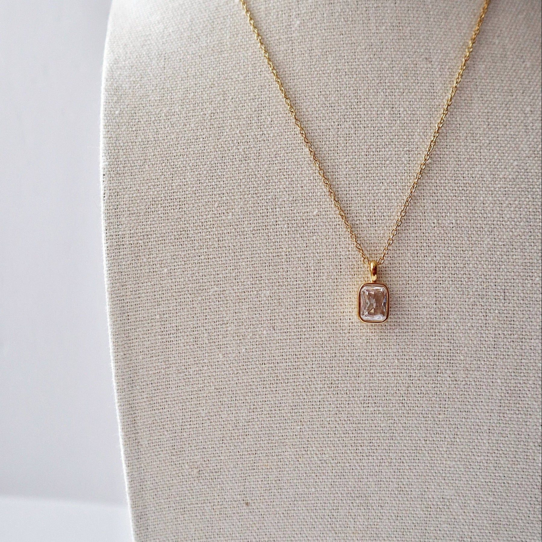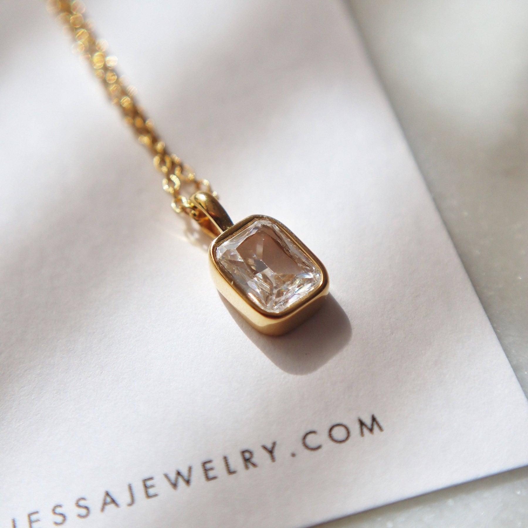 The Haven Necklace - a classic, timeless beauty. This rectangular bezel pendant showcases a CZ stone that catches the light effortlessly, paired with a fine dainty chain for an elegant everyday look. Perfect for everyday elegance or to dress up for special occasions. -stainless steel, 18k gold plated -16" in length with 2" extender