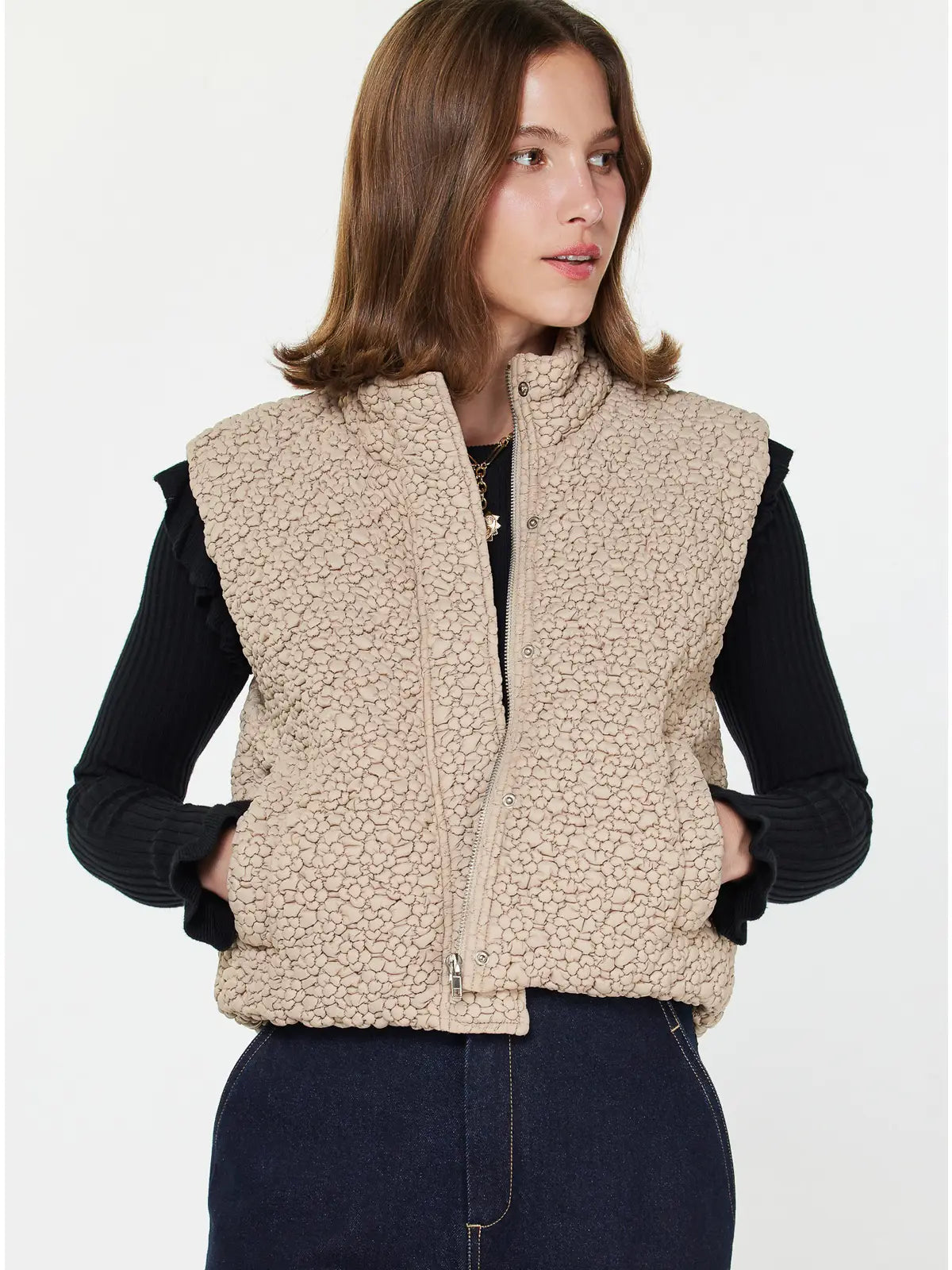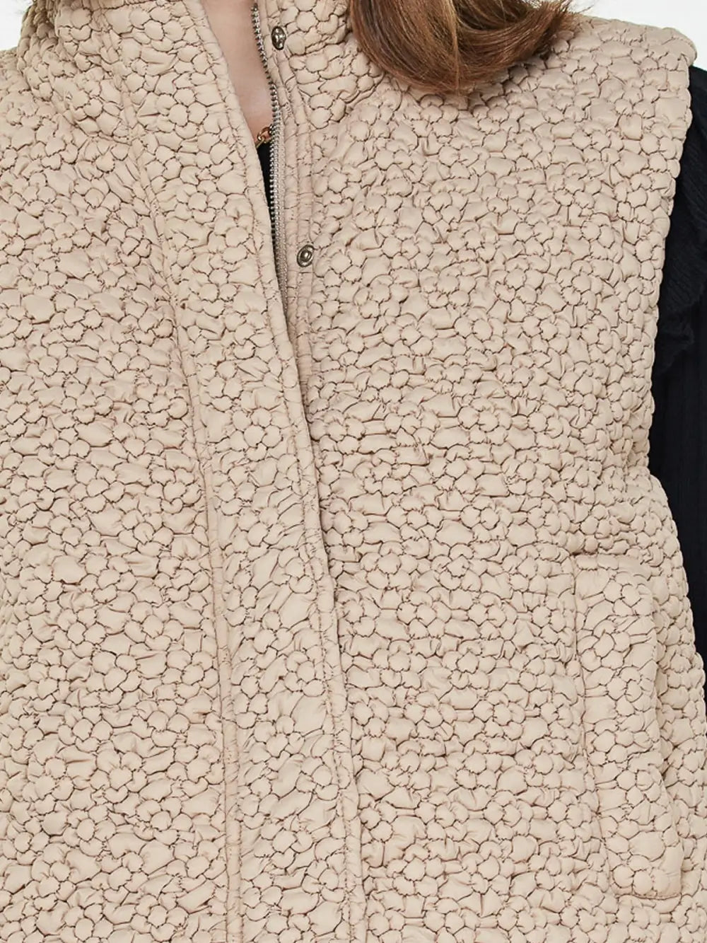 The high neck provides extra coverage and a sleek silhouette, while the front zip-up and snap-button placket offer both function and polished detail. With its cropped cut and relaxed fit, this vest is flattering and easy to layer over long-sleeve tees, sweaters, or lightweight knits. Side slip pockets add the practicality you need without sacrificing style.