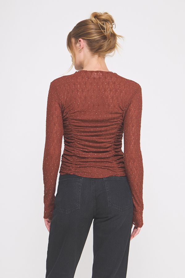 Chic, feminine, and subtly glamorous — the Embellished Lace Ruched Top is your new go-to for effortless sophistication. Crafted from a soft polyester-spandex blend, this long-sleeve lace top features delicate embellishments that shimmer with every move.