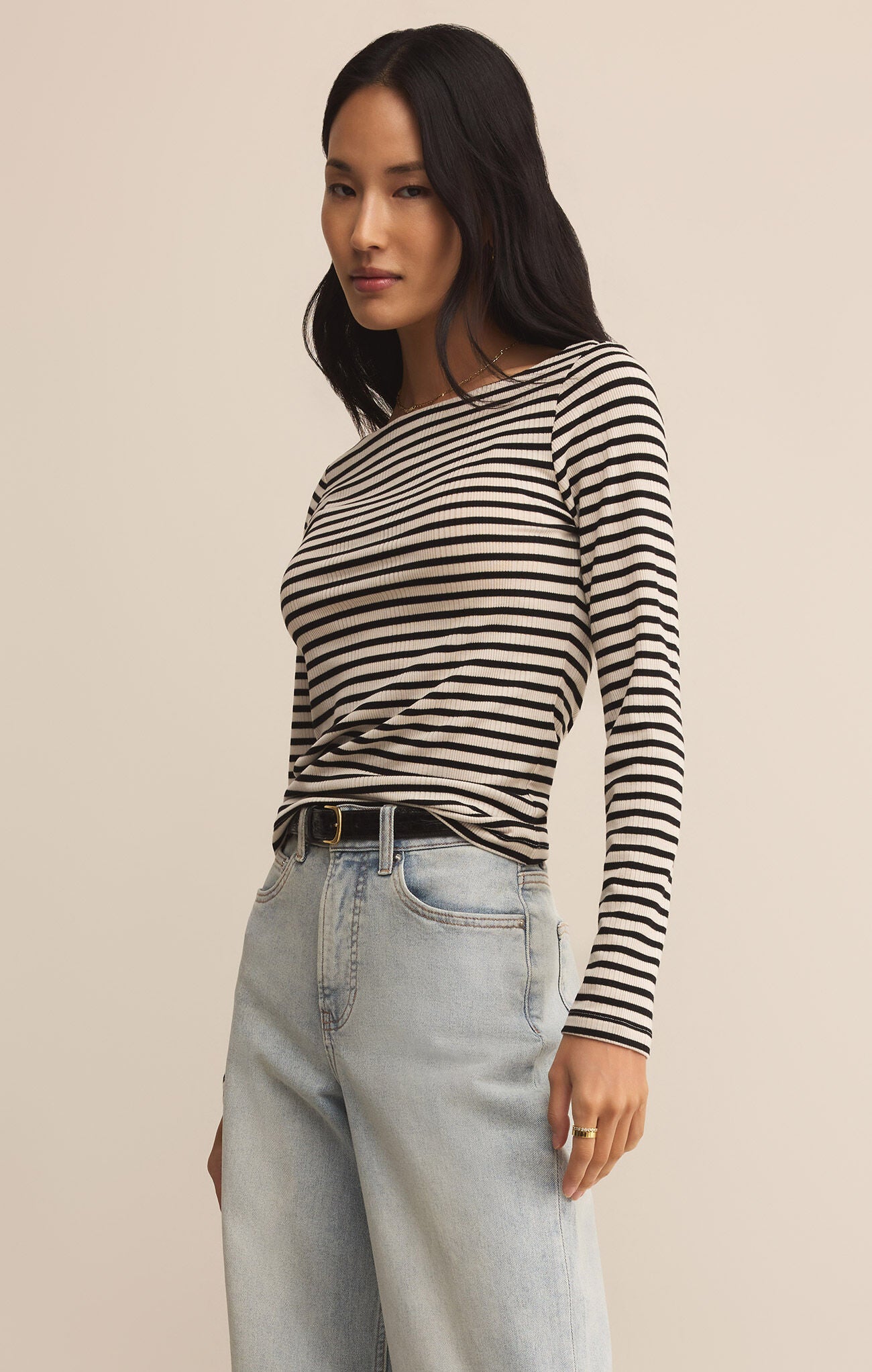 The flattering boat neckline sits gracefully along the collarbone, offering a modern, slightly wider shape that’s both feminine and versatile. It’s the perfect complement to the top’s fitted body, balancing sophistication and simplicity with ease. Whether you wear it tucked into high-rise trousers or layered under a blazer or cardigan, the neckline adds a polished, understated touch to any outfit.